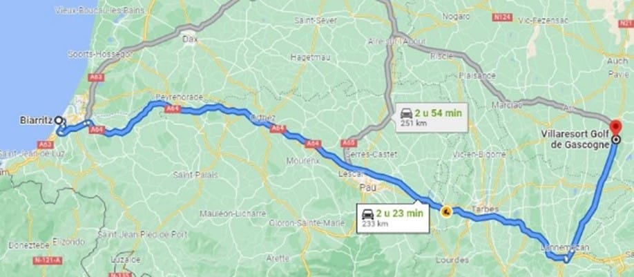 Richting Biarritz rijdt je ongeveer 2 uur en 23 minuten.